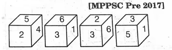 Cube & Dice Share with your Friend Facebook Twitter LinkedIn WhatsApp Telegram Q1: जब एक पासे को चार बार फेंका जाता है, तो प्रत्येक बार निम्न परिणाम आते है। निम्न संख्याओं में से कौन-सी संख्या पासे में '3' के विपरीत होगी? 4 6 1 5Enter Full Name Submit & See Your Score